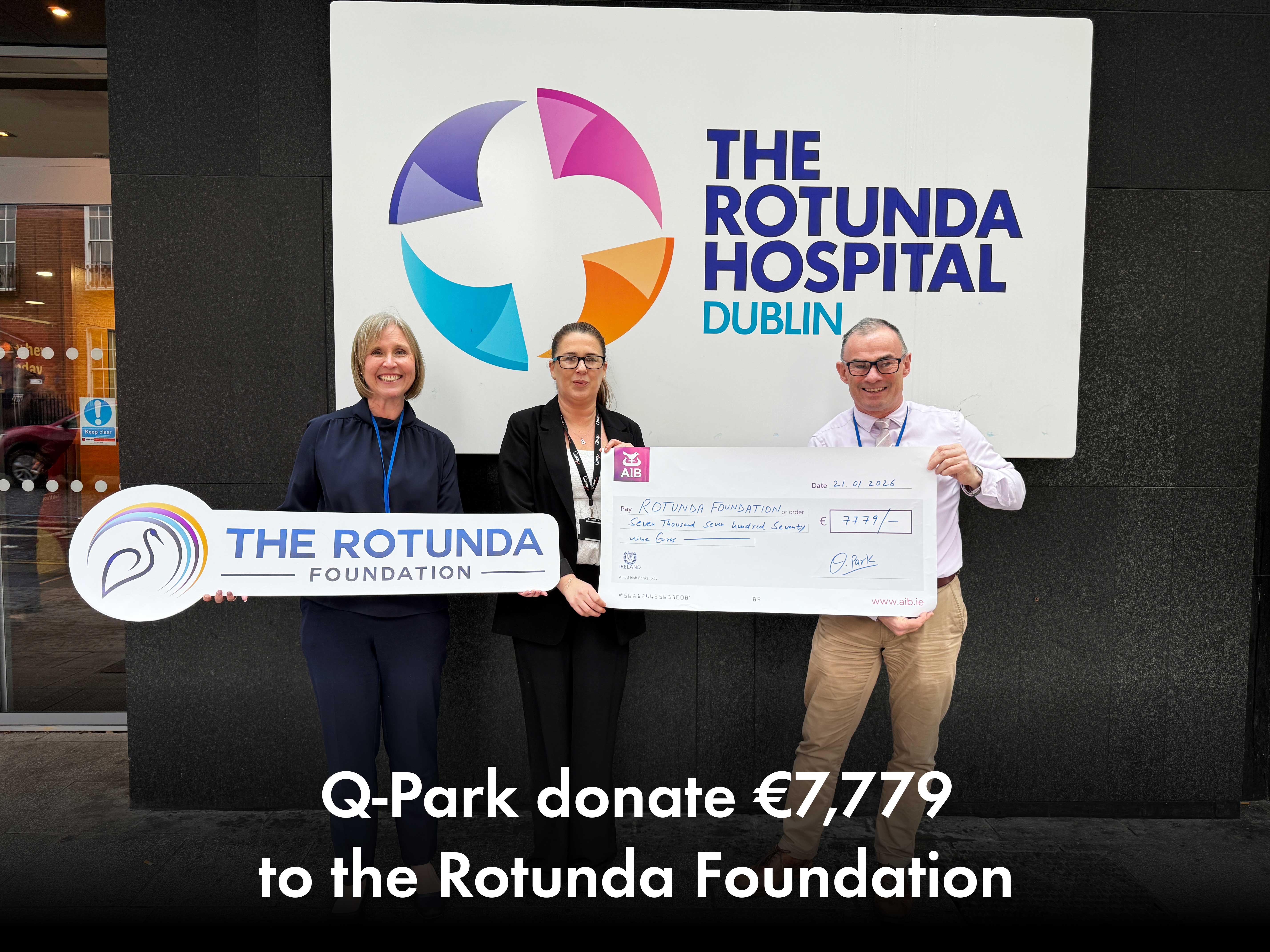 | Q-Park is proud to announce a €7,779 contribution to the Rotunda Foundation, supporting the vital work carried out by the Rotunda Hospital in Dublin City Centre as well as delivering discounted parking at Q-Park Parnell